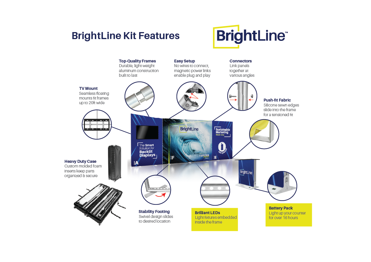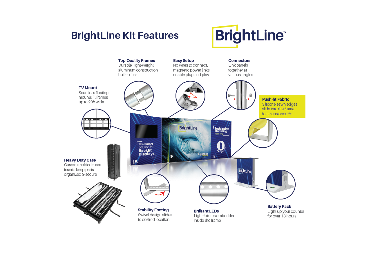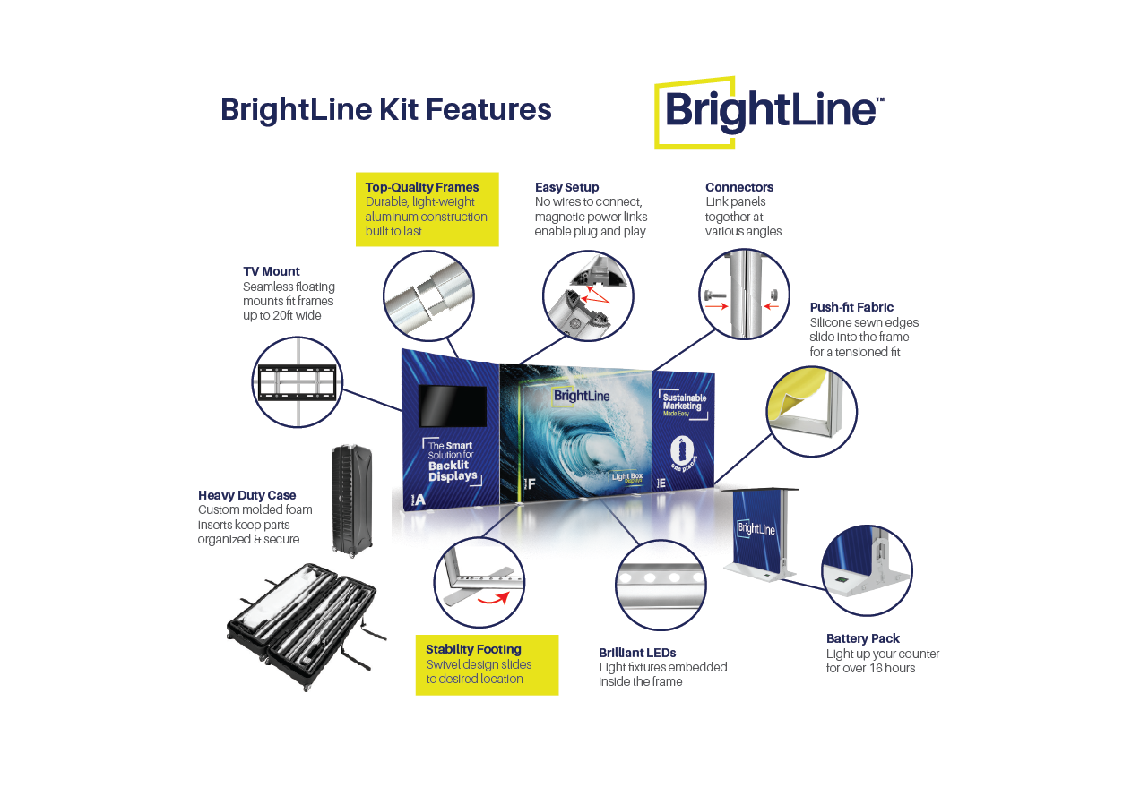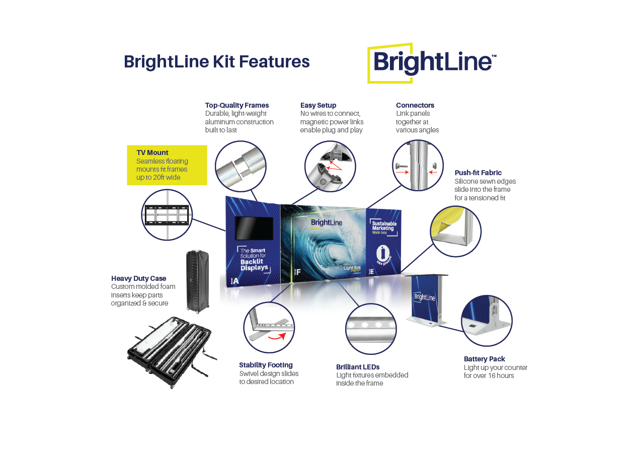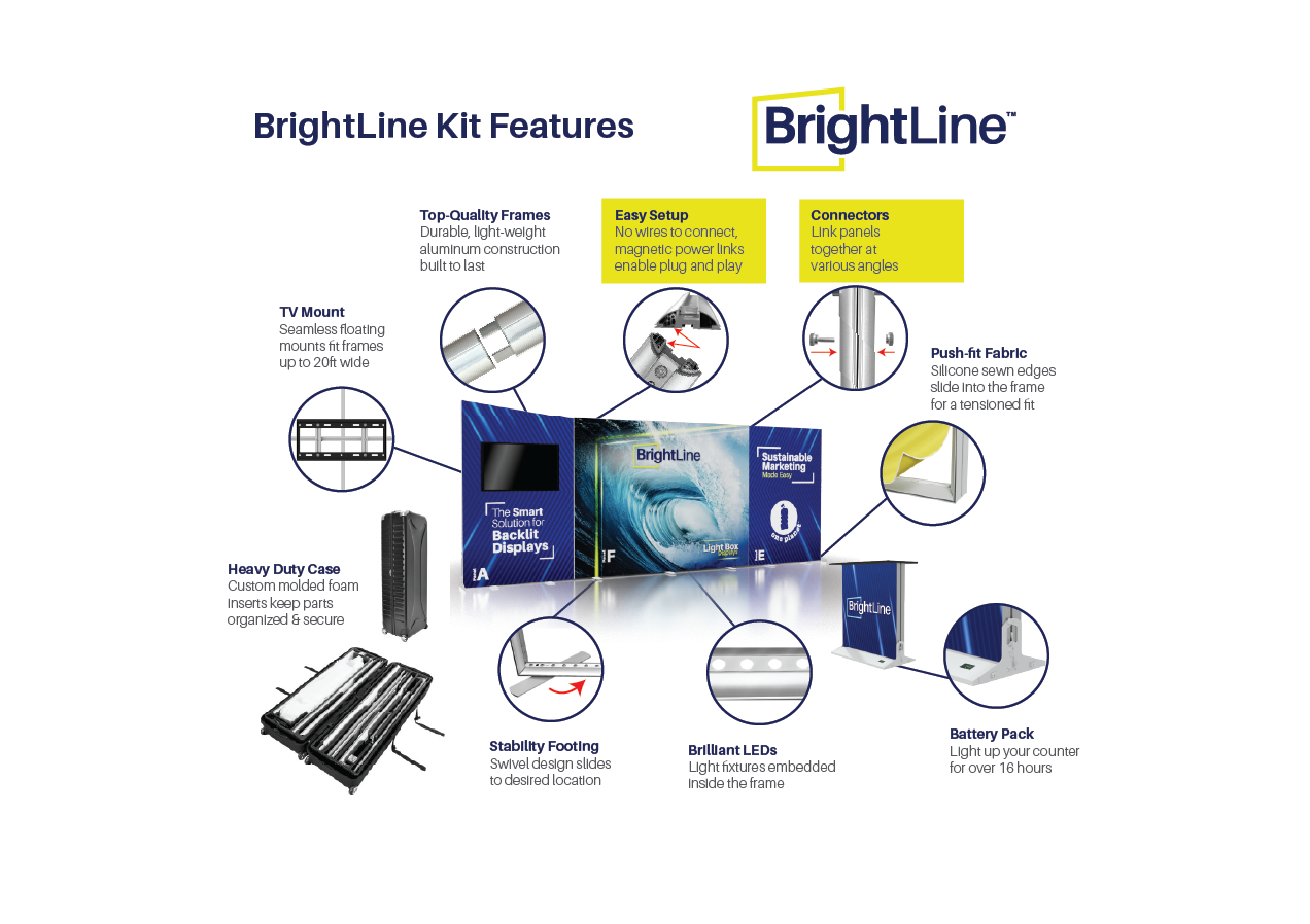 Explore our illuminated BrightLine exhibit light box display kits. With modern designs for any event or conference, these brilliant exhibits captivate from a distance. Kits combine BrightLine, StraightLine, and Waveline panels of different shapes and sizes, connected with tool-less connectors for a sleek look. For a sleek look suited for different venues or brand needs. Floating TV mounts and battery-powered counters add functionality, creating branded environments that truly stand out.