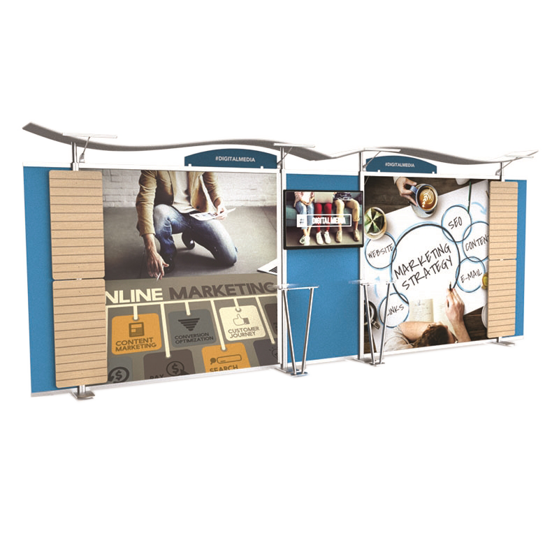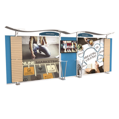 The Timberline hybrid 20ft display offers a unique and modern appearance. With the SEG (silicone edge graphic) fabric center graphic you can easily update your message per show if needed. Just pop into the aluminum framing and you're done! Plus, the two aluminum base feet create a stable structure to sit within your booth space.