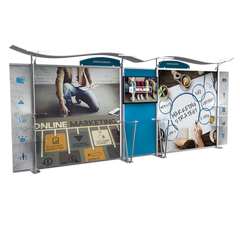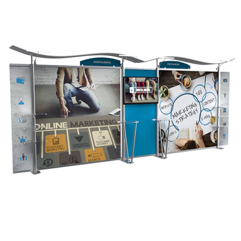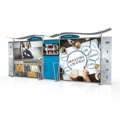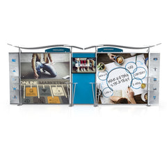 The Timberline hybrid 20ft display offers a unique and modern appearance. With the SEG (silicone edge graphic) fabric center graphic you can easily update your message per show if needed. Just pop into the aluminum framing and you're done! Plus, the two aluminum base feet create a stable structure to sit within your booth space.