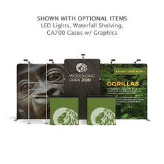 Our optional items increase the productivity in your trade show display space. Add the most popular and useful 36" Waveline banner stand and Waterfall shelving kit. Protect your new tension fabric display by upgrading to the CA700 shipping case along with a podium graphic wrap. Or make sure to add illumination by purchasing LED Light fixtures. With the addition of the Monitor Bracket/VESA mount or 19" monitor mounting bracket, freely display your favorite product or brand video (Monitor not included).