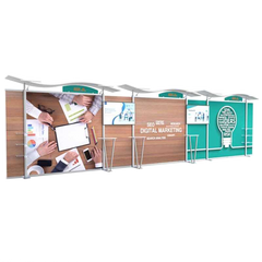 The 30ft Timberline hybrid trade show display series is the perfect combination of a modern, custom look without the expensive price tag. Your custom message will be delivered to all attendees by our high definition dye-sublimation printed graphics to show off your brand. Add custom printing to the top arch header to further allow your logo brand to stand out.