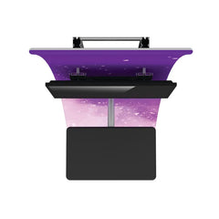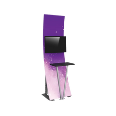 Formulate® Kiosk 01 couples a lightweight vertical curved aluminum tube frame with a printed stretch zipper pillowcase fabric graphic to create a funky and functional multimedia kiosk. An integrated monitor mount and table top provide space for digital messaging and display, and the gently curving back panel draws the eye. *Monitor not included.