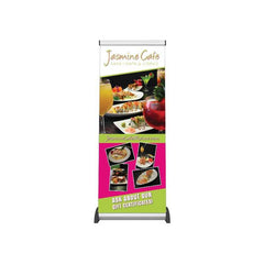 The Mini31 Countertop Banner Stand is an affordable retractable tabletop banner stand that features a silver base and sleek black endcaps. It is the perfect height for a tabletop display. It is the perfect banner stand to maximize real estate in an exhibit.